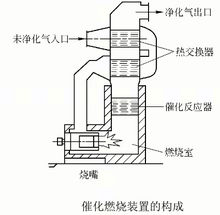 催化燃燒裝置主要由熱交換器、燃燒室、催化反應(yīng)器、熱回收系統(tǒng)和凈化煙氣的排放煙囪等部分組成,如右圖所示。其凈化原理是:未凈化氣體在進(jìn)入燃燒室以前,先經(jīng)過(guò)熱交換器被預(yù)熱后送至燃燒室,在燃燒室內(nèi)達(dá)到所要求的反應(yīng)溫度,氧化反應(yīng)在催化反應(yīng)器中進(jìn)行,凈化后煙氣經(jīng)熱交換器釋放出部分熱量,再由煙囪排入大氣。